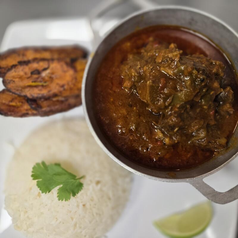 Slowed roasted ribeye steak, onion, bell peppers, garlic, tomato simmered in tomato-base creole sauce served with white rice, black beans and fried green plantains.